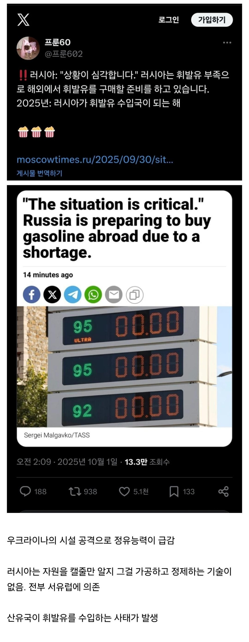 휘발유 부족으로 다른 국가에 휘발유를 수입하는 러시아
