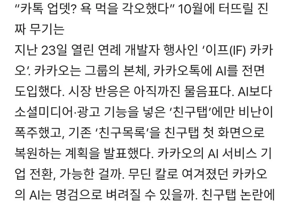 [단독] 백기 든 카톡, 이렇게 바뀐다…친구·피드 분리 된장맛주스 0 5 0 0 10.04 21:44 주소복사 복사되었습니다! https://v.daum.net/v/20251002060258186 1. 친구 목록/피드 분리 업데이트 2. 몇달전 Chatgpt와 카카오의 협업 발표됨. 0 0