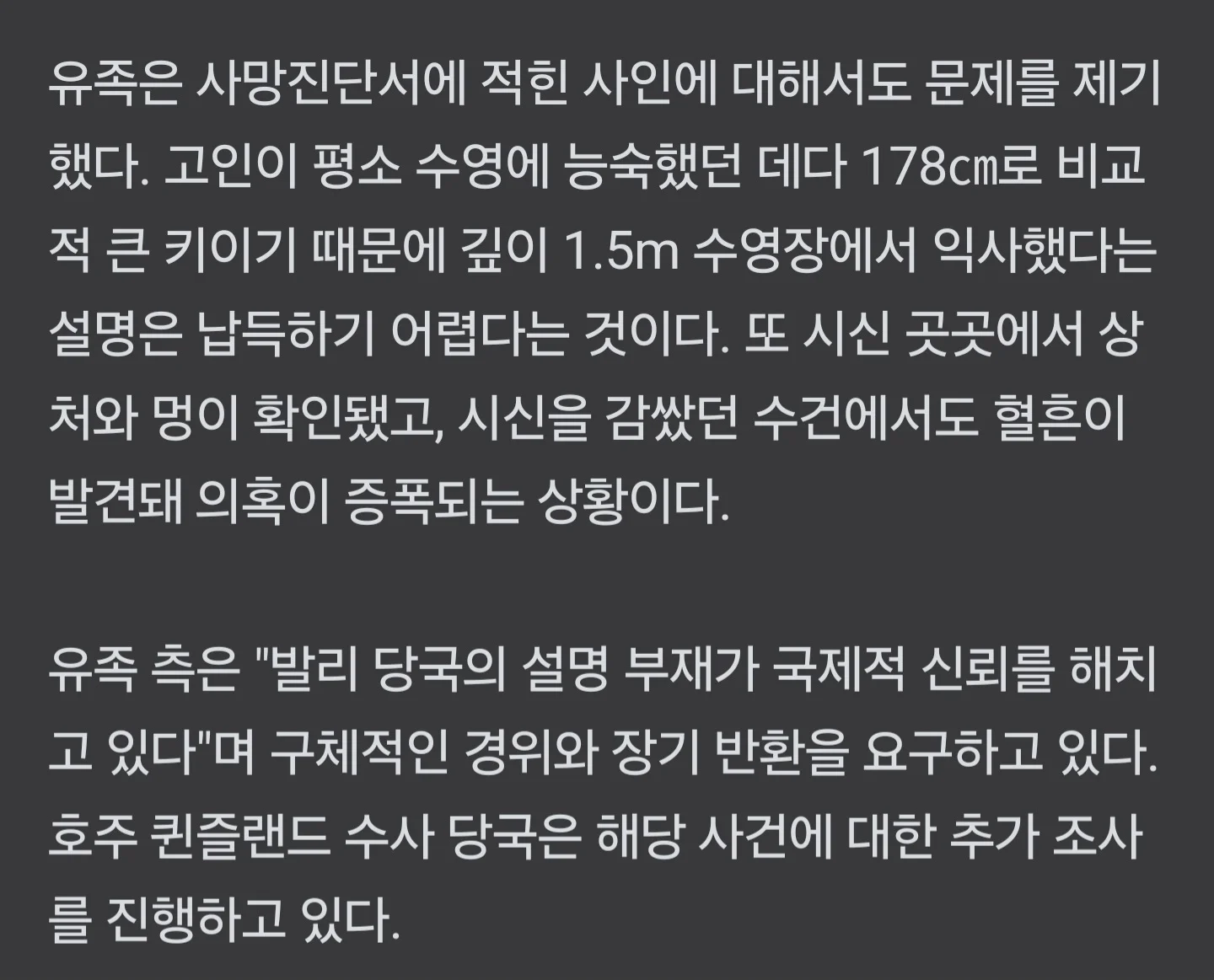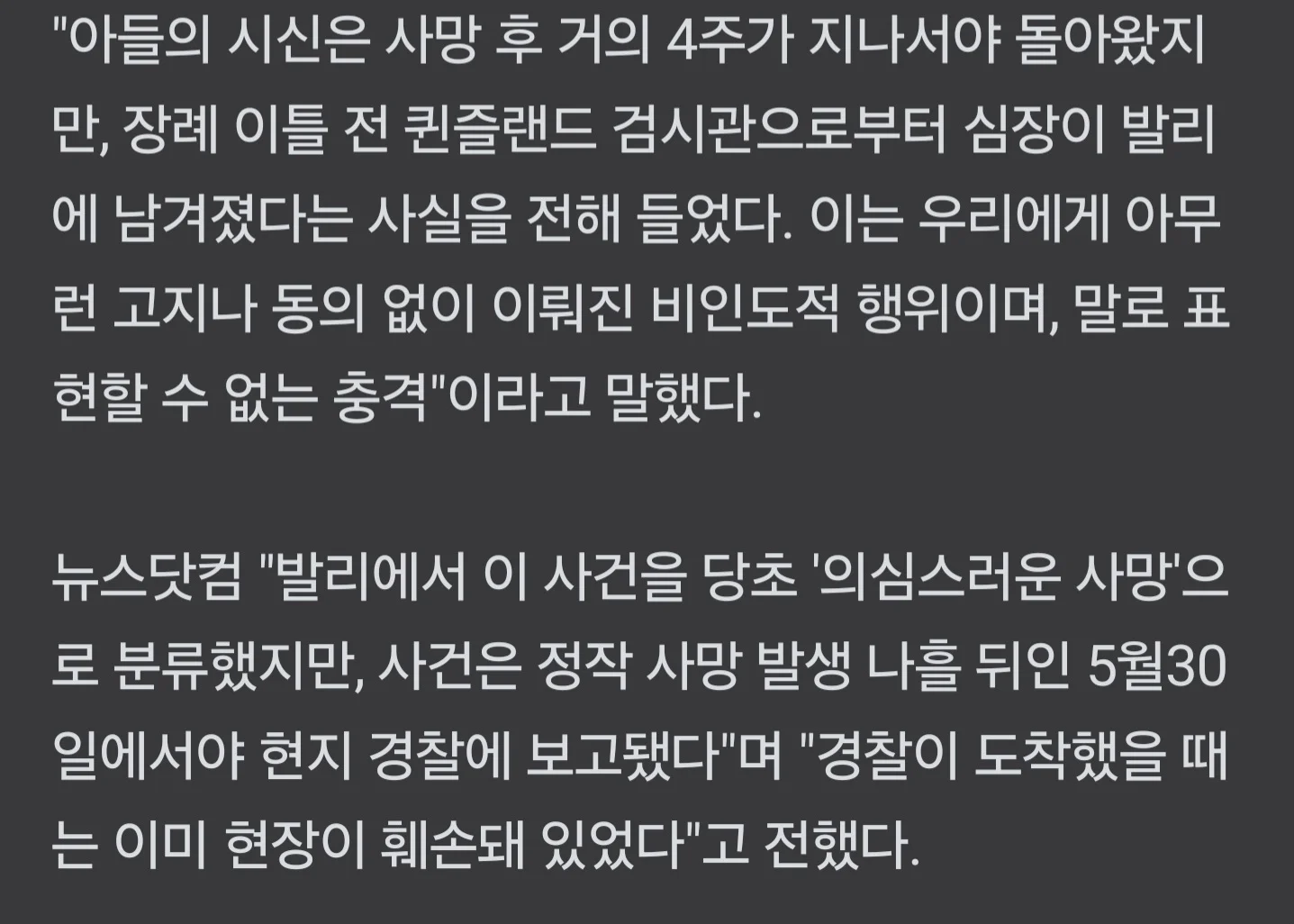 발리서 익사한 아들 시신 받았는데 "심장 어디갔어" 호주 유족 분통