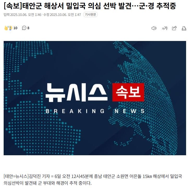 속보) 충남 태안군 소원면 어은돌 15km 해상에서 밀입국 의심선박