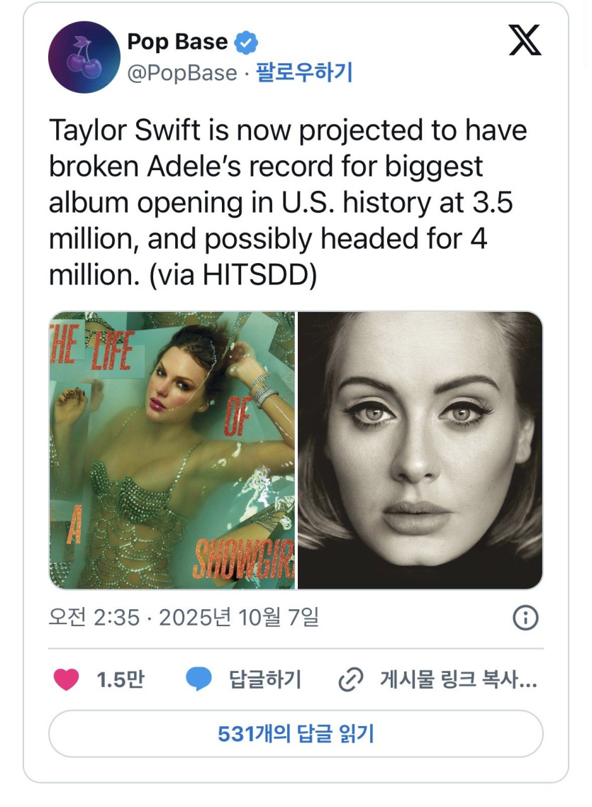 3일전 발매한 테일러 스위프트 신보가 아델 초동기록 깨고 400만 향하는 중