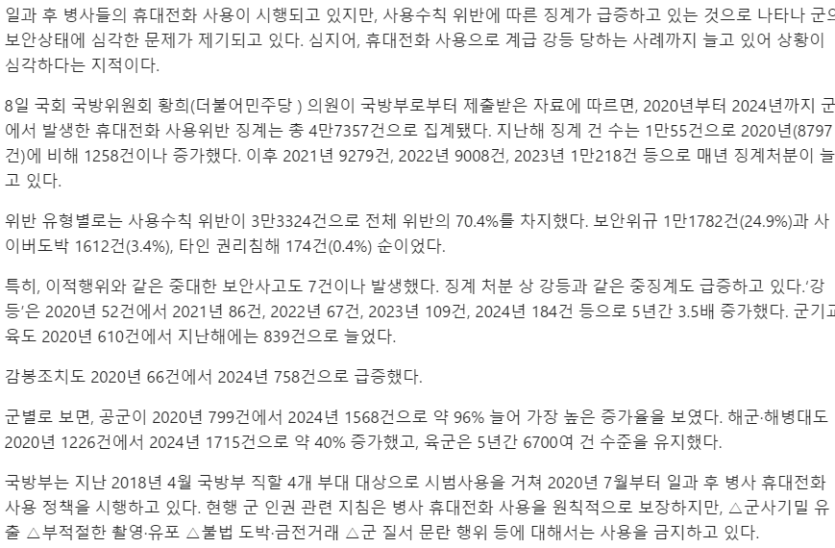 병사 휴대전화 사용 징계 급증... 감봉, 계급 강등