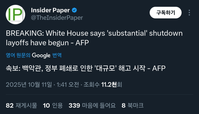 [속보] 백악관, 미국 연방 셧다운으로 대규모 해고 시작