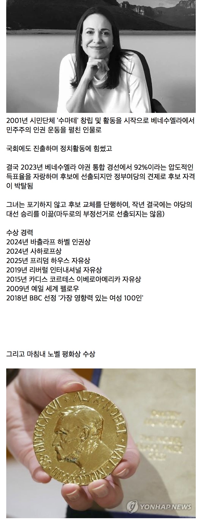 노벨평화상을 수상한 마리아 코리나 마차도는 누구인가?