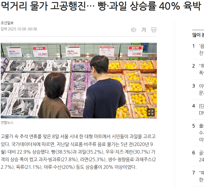먹거리 물가 고공행진… 빵·과일 상승률 40% 육박 불량식품 0 2 0 0 3시간전 주소복사 복사되었습니다! https://www.chosun.com/economy/industry-company/2025/10/09/GMBIZP7ATNGJ3JGCY4ZXS267BU/?utm_source=naver&utm_medium=referral&utm_campaign=naver-news 0 0
