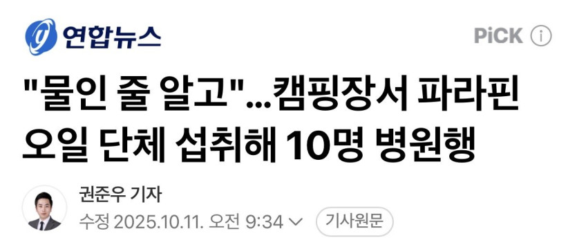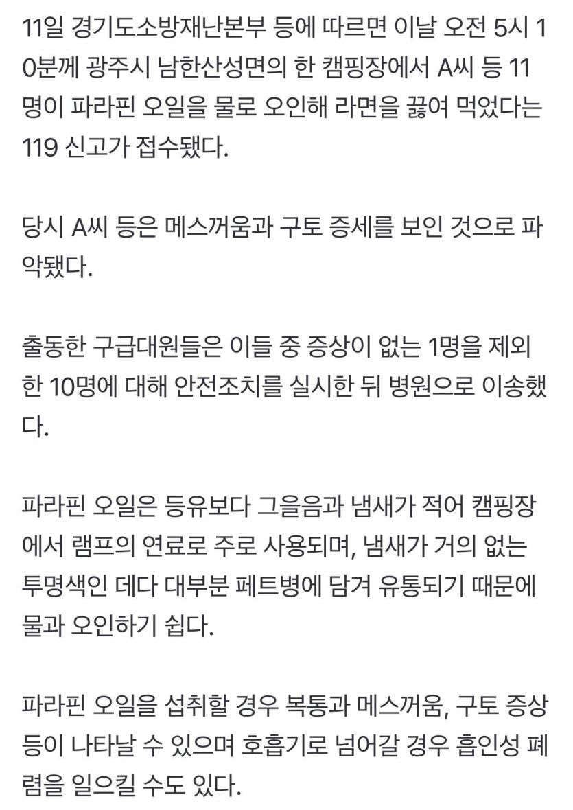 "물인 줄 알고"…캠핑장서 파라핀 오일 단체 섭취해 10명 병원행 김뱁새 0 10 0 0 3시간전 주소복사 복사되었습니다! https://naver.me/GMPc4Cod https://naver.me/GMPc4Cod 0 0