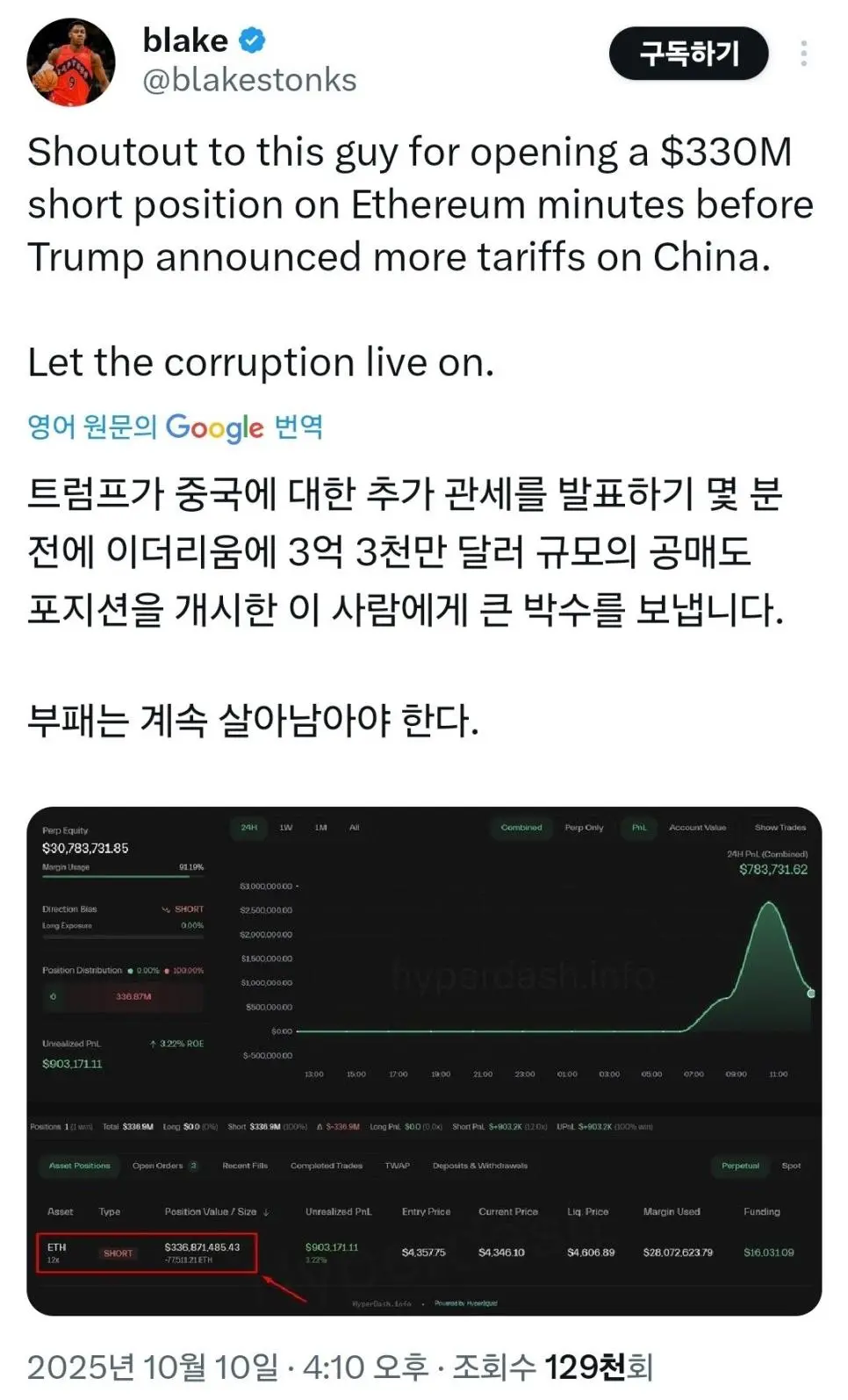 트럼프 발표전 나온 의심스러운 거액의 공매도 아빠1호 0 4 0 0 3시간전 주소복사 복사되었습니다! 새벽에 비트코인이 122000$-> 102000-15% 떨어지는 하락빔이 나옴 다른 알트들은 -30~50% 까지 빠짐원화로 거의 27조되는 돈이 청산 0 0