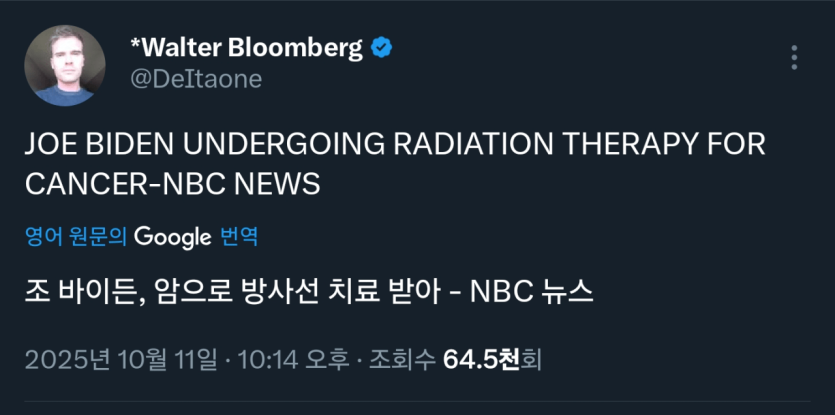 조 바이든 암으로 인해 방사선 치료를 받음