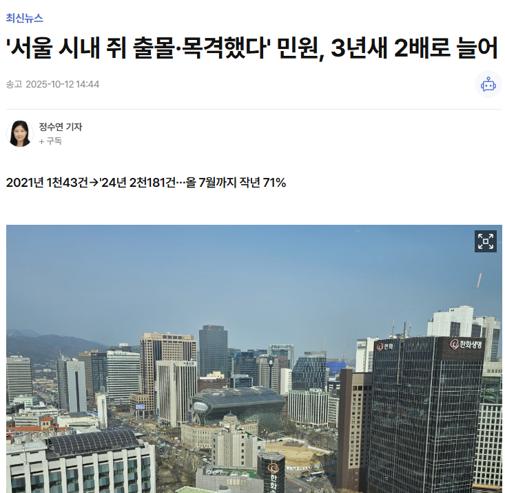 '서울 시내 쥐 출몰·목격했다' 민원, 3년새 2배로 늘어 돼슴도치 0 6 0 0 2시간전 주소복사 복사되었습니다! https://www.yna.co.kr/view/AKR20251012024900004 https://www.yna.co.kr/view/AKR20251012024900004 0 0