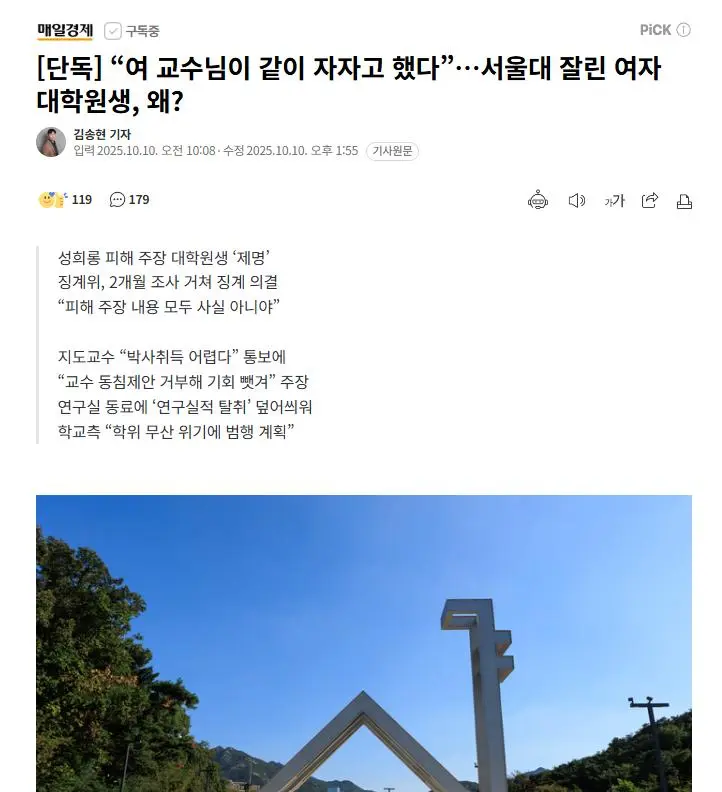 서울대 대학원 교수 동성 성희롱 폭로사건의 결말 나쵸매니아 0 14 0 0 2시간전 주소복사 복사되었습니다! 박사 학위 취득이 어렵다는 통보를 받자 교수한테 누명 씌운 거였음 참고로 박사학위는 학교마다 규정이 다르긴 하지만 요건 안되면 그냥 아예안줌 0 0
