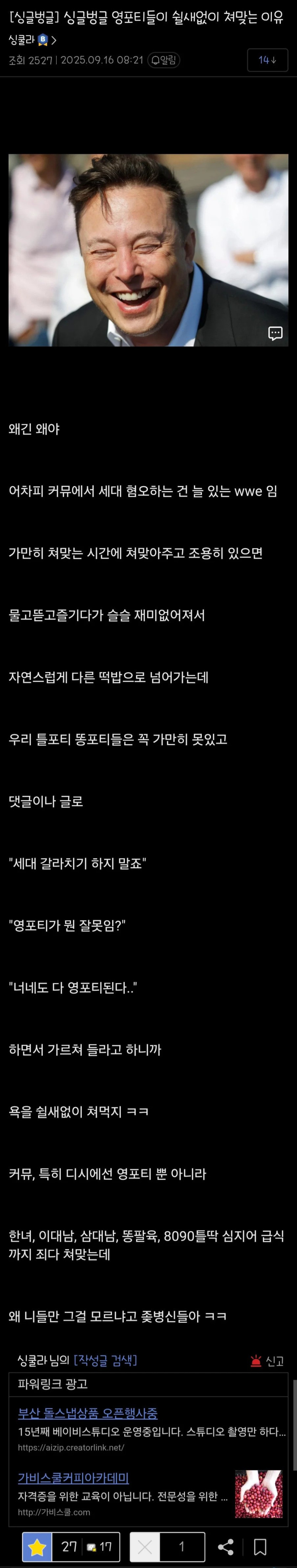 싱글벙글 포티햄들이 쉴새없이 뚜드려 맞는 이유.jpg 여의도피멍 0 6 0 0 2시간전 주소복사 복사되었습니다! 조카들이랑 놀아주는거마냥 WWE를 진짜 존나 맛있게 받아줌 ㅋㅋㅋㅋㅋ 진짜 타격감 GOAT 개인적으로는 커뮤에서 볼 법한 그런 부류들이 주변에 없어서 그냥 커뮤 농담따먹기 정도로 생각함ㅋㅋㅋ 0 0