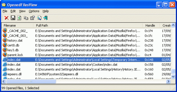 OpenedFilesView는 시스템에 열려 있는 모든 파일 목록을 표시합니다. 열려 있는 각 파일에 대해 핸들 값, 읽기/쓰기/삭제 액세스, 파일 위치, 파일을 연 프로세스 등의 추가 정보가 표시됩니다. 추가로 하나 이상의 열린 파일을 닫거나 해당 파일을 연 프로세스를 닫을 수 있습니다.