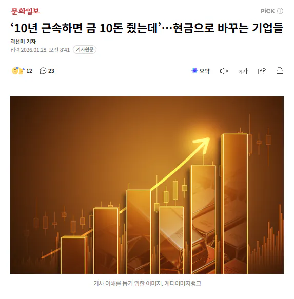 https://www.munhwa.com/article/11564179최근 금값이 폭등하면서 사상 최고치를 경신하자 제약업체 등 기업들이 장기근속 포상을 금 대신 현금으로 교체한 것으로 알려졌다.