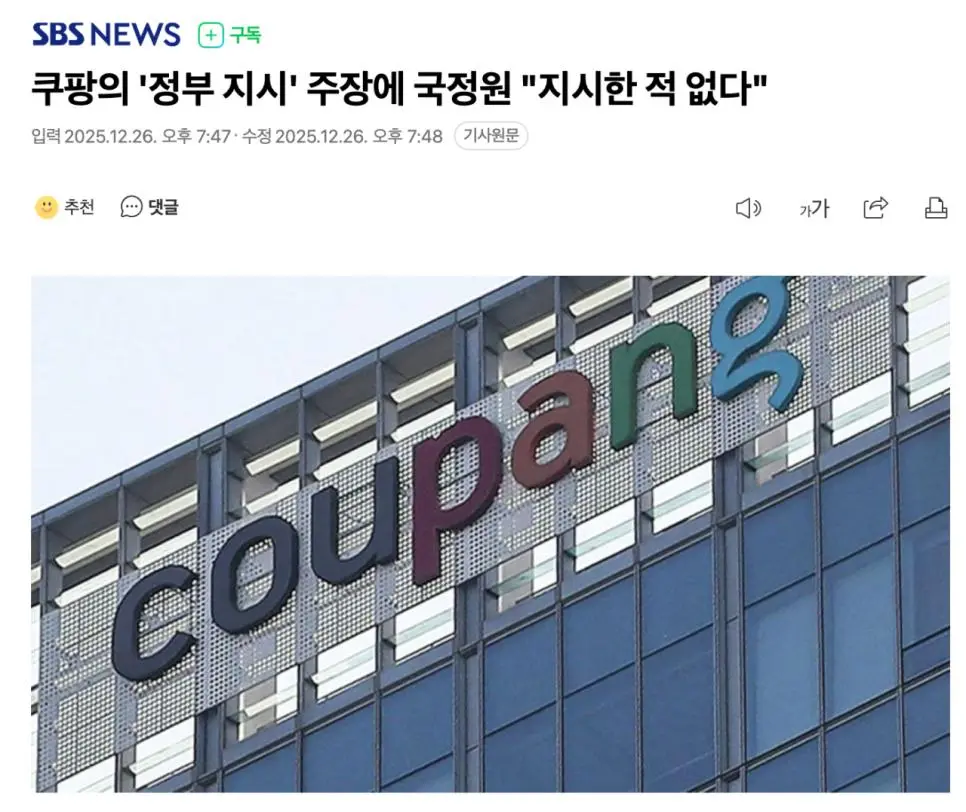 [속보] 국정원 "쿠팡에 지시한 적 없다" 코와붕가2 0 141 0 0 2025.12.27 09:42 주소복사 복사되었습니다! ??? 지금 쿠팡은 대한민국 정부랑 멸망전 해보자는거지? 0 0