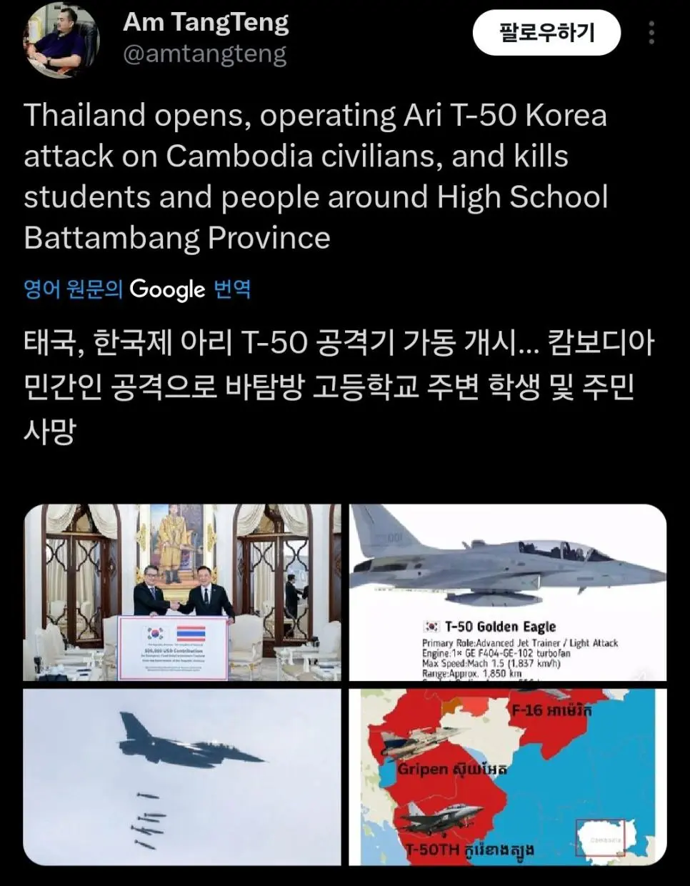 캄보디아 태국과의 전쟁에 한국도 책임있다 단감한상자 0 46 0 0 12.28 13:28 주소복사 복사되었습니다! 저기 한국 태국 높으신분들 악수하는 사진은 무기공급 협약식이 아니라,태국 수해 지원금을 주는 장면이다. 보이스피싱의 나라답게 주작밖에 못하는...이미 사간 물건인데 우리가 뭐 어쩌라고?? 0 0