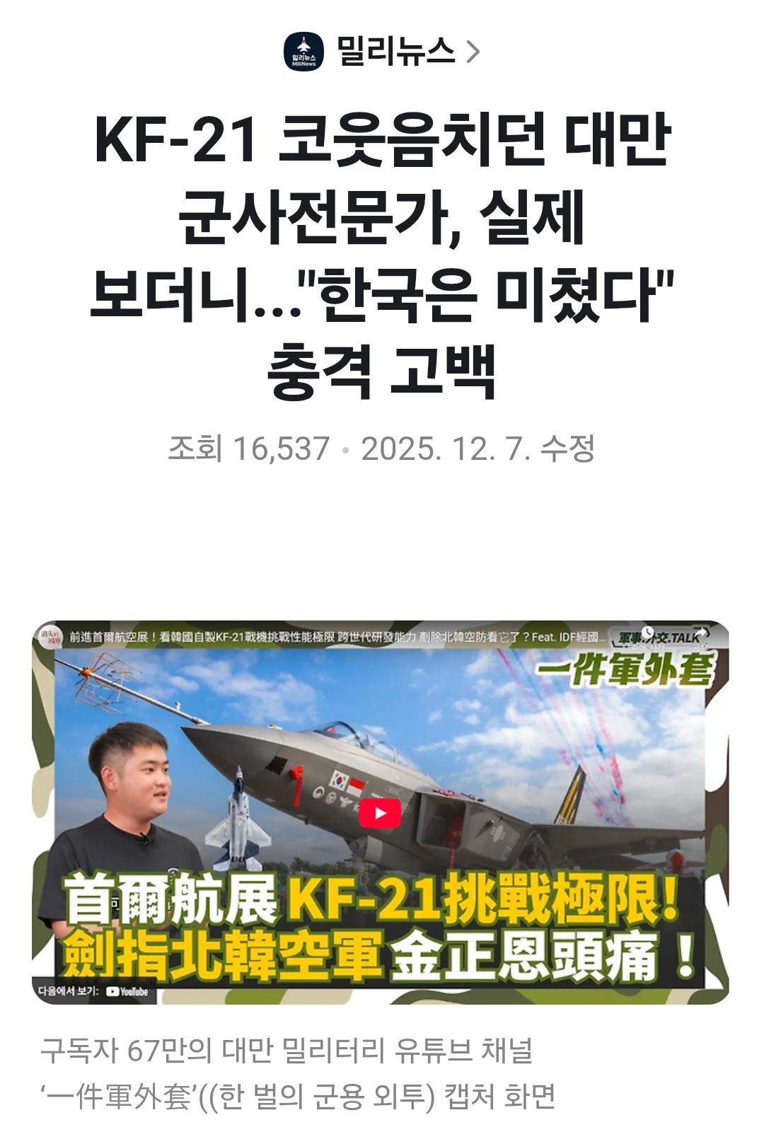 KF-21 개무시하던 대만 군사전문가...실제로 보더니 비틀어짜기 0 1 0 0 1시간전 주소복사 복사되었습니다! 유독 동남아 애들이 가성비를 강조하며 한국산 무기를 싸구려 취급하는 애들이 많던데 규모의 경제라고 남북한 대치 중이라 무기를 꾸준히 찍어내니 가격이 내려갈 수밖에... 0 0