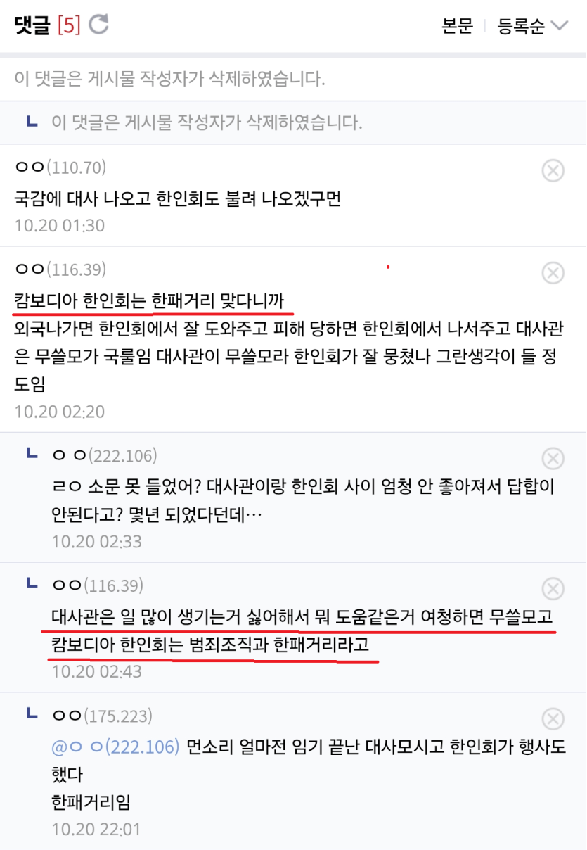 캄보디아 교민들 즉 한인회는 범죄조직이랑 한패거리라는 소문도 떠돌고 있음.