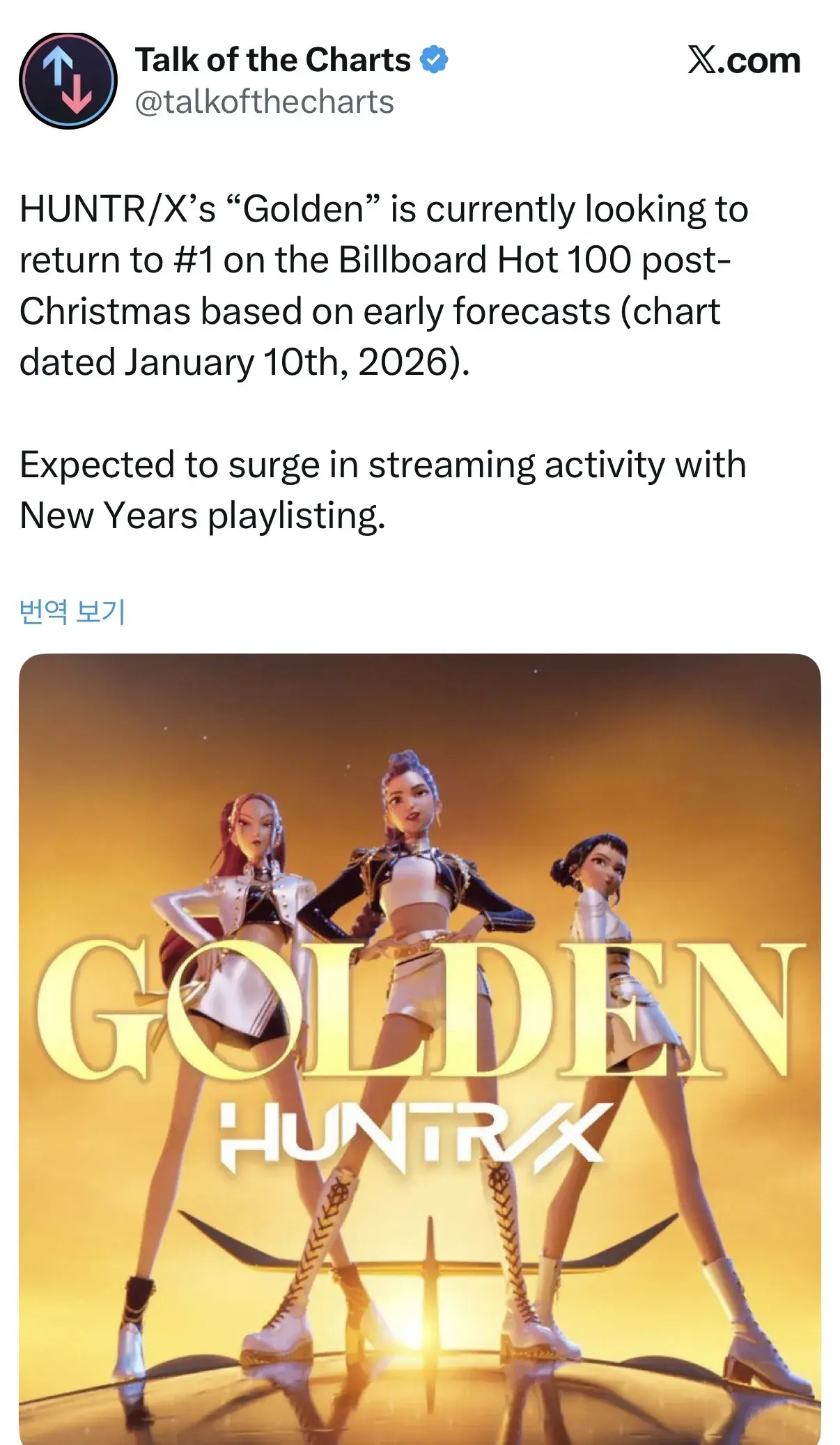 다음주 케데헌 골든 빌보드 1위 탈환 가능성 안양김군 0 81 0 0 2025.12.30 00:39 주소복사 복사되었습니다! 만약 1위 다시 탈환하면 테일러 스위프트마저 꺾는듯 0 0
