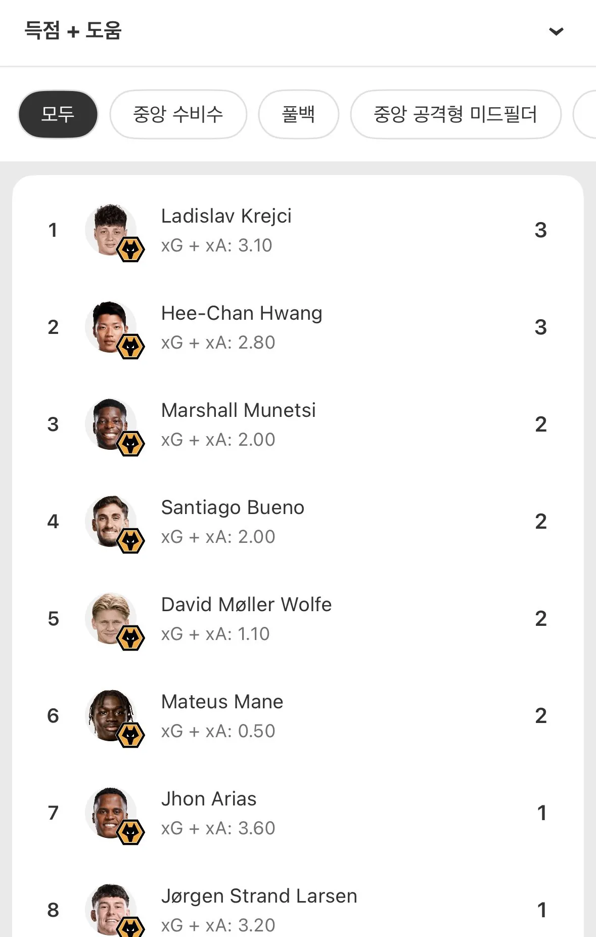 [오피셜] 울버햄튼 공격포인트 1위는 황희찬 ㄷㄷㄷㄷㄷㄷ 물음느낌표 0 33 0 0 01.04 03:00 주소복사 복사되었습니다! 공격포인트 3개로(2골 1도움) 크레이치와 함께 공동 1위 0 0