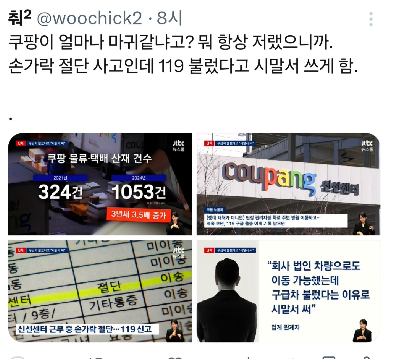 쿠팡, 손가락 잘려 119 부른 직원 시말서 쓰게 해