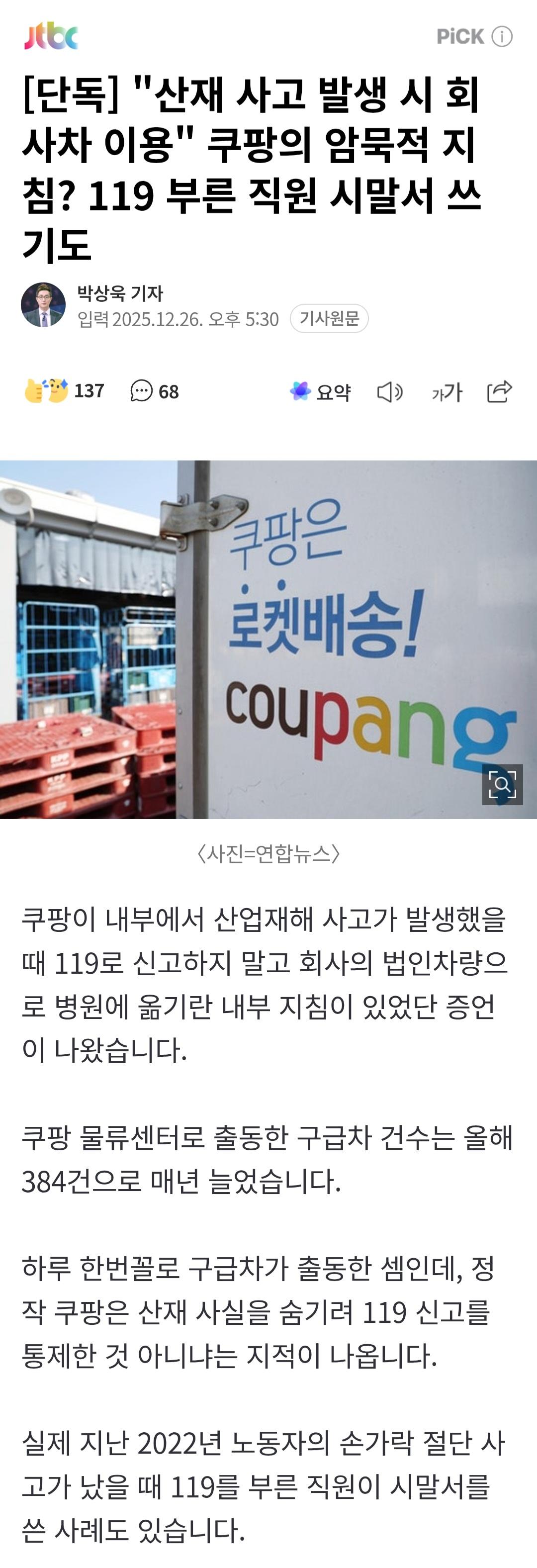 쿠팡, 손가락 잘려 119 부른 직원 시말서 쓰게 해