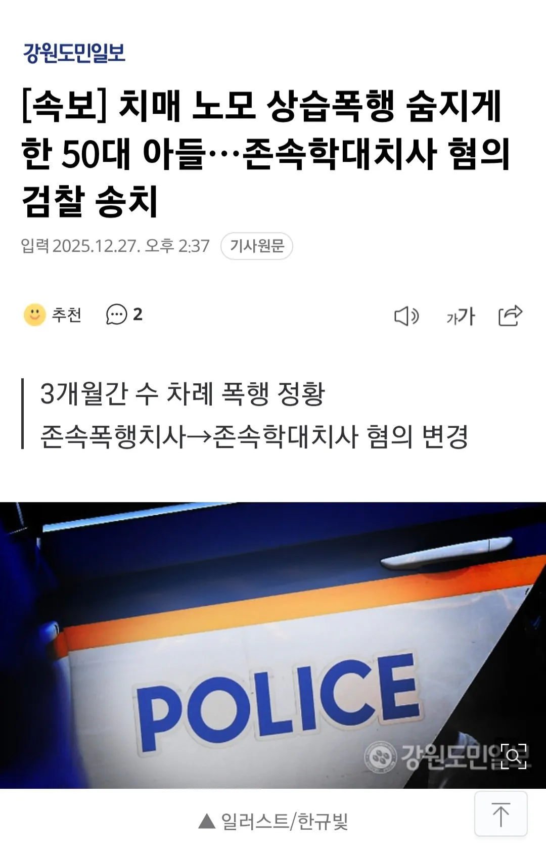 [속보] 치매 노모 상습폭행 숨지게 한 50대 아들…존속학대치사 혐의 검찰 송치