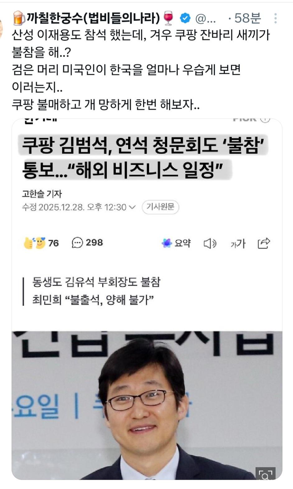 삼성 이재용도 참석했는데, 겨우 쿠팡 잔바리 새X가 불참을 해..?