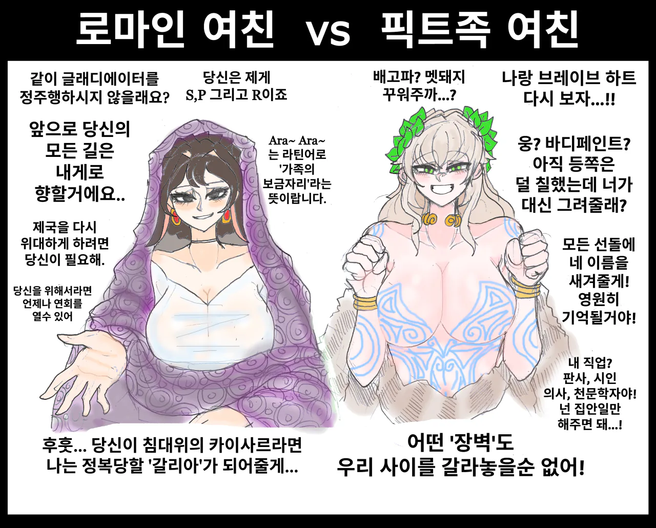 (약후) 로마인 여친 VS 픽트족 여친 .manhwa melt 0 21 0 0 3시간전 주소복사 복사되었습니다! 로마시대 여성복은 시대 구분이 제 눈에는 크게 안보여서 대충 제정 시기풍으로 그렸습니다. 영문판에는 픽트족 친구가 스코틀랜드 사투리를 쓰는걸로 그렸는데....강원도 사투리를 쓰게 번역하는건 좀 이미지에 안맞아서 일반 어체를 썼습니다 한편 TS로마인 친구는 암컷타락이 착착 진행중이에오 꿈에서는 이미 엄마가 될 준비 만전인듯해오. 조야한 그림을 보아주셔서 감사합니다...! 0 0