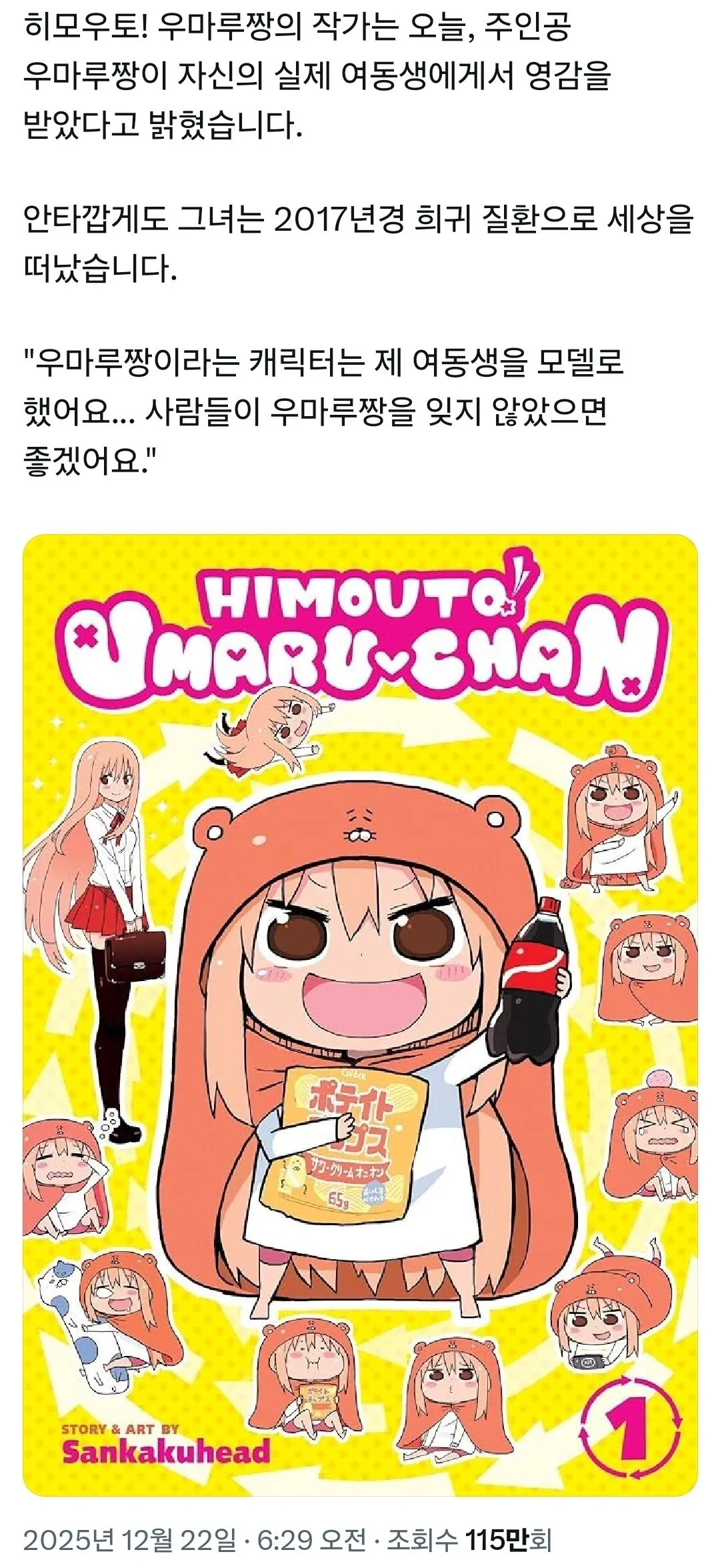 최근 <건어물 여동생 우마루짱>작가가 밝힌 이야기.. 22222 0 23 0 0 12.28 23:12 주소복사 복사되었습니다! 집에서 빈둥거리던 자신의 여동생이 모티브였고 2017년 여동생은 희귀병으로 세상을 떠났다 그래서 조기 완결 했다고.. 0 0