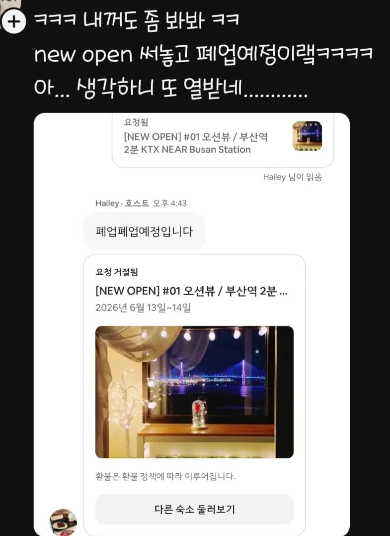 현재 급작스럽게 폐업이나 리모델링이 많아졌다는 곳 ㄷㄷ 손만잡고할께 0 49 0 0 01.16 21:00 주소복사 복사되었습니다! 부산 숙박업체들 ㄷㄷ갑작스러운 폐업(new open)과 리모델링에 들어갔다고 함 ㄷㄷ 0 0