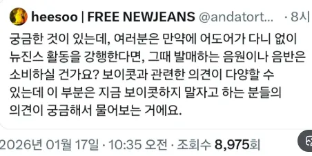 하이브로 복귀한 뉴진스는 소비하지 않겠다는 뉴진스팬들 오유바보 0 45 0 0 01.17 20:48 주소복사 복사되었습니다! 어제 다니엘의 편지 공개이후 복귀한 멤버들에 대한 시선이 매우 안 좋아짐 복귀를 주도한 혜인 아버님에 대한 반감도 서슴치 않고 드러내는 중 0 0