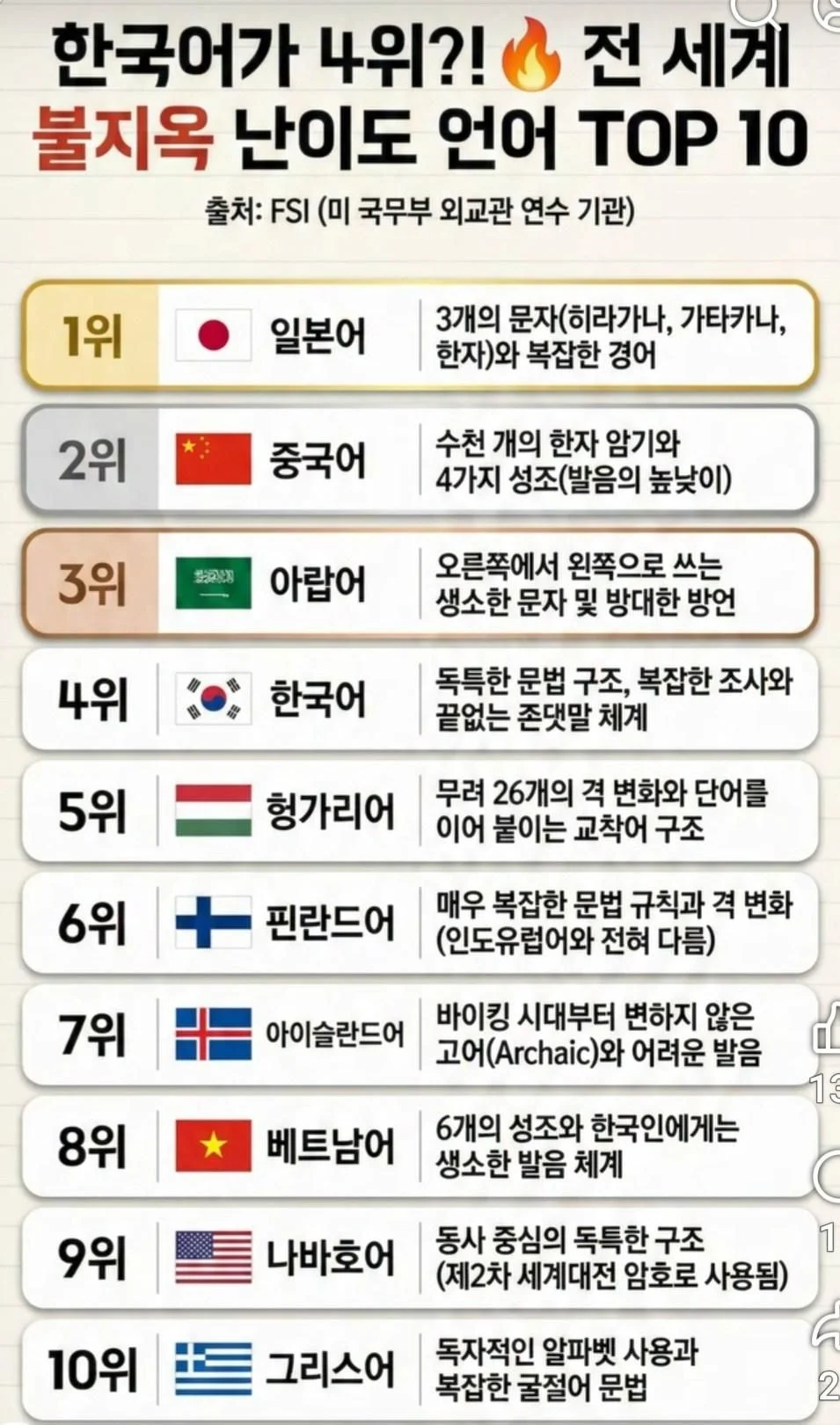 美 국무부 외교관 연수 기관 피셜 세계 10대 지옥 난이도 언어