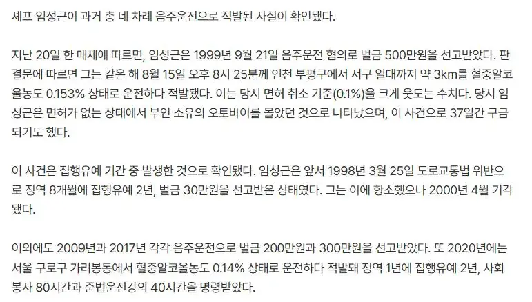 임성근, 37일 구금된 적도 있어 호새구끼야 0 89 0 0 01.21 12:00 주소복사 복사되었습니다! https://m.entertain.naver.com/home/article/312/0000745150 음주운전으로 98년 집유 2년 99년 벌금 500만 09년 벌금 200만 17년 벌금 300만 20년 집유 2년 교화가 전혀 안되고 있음 0 0