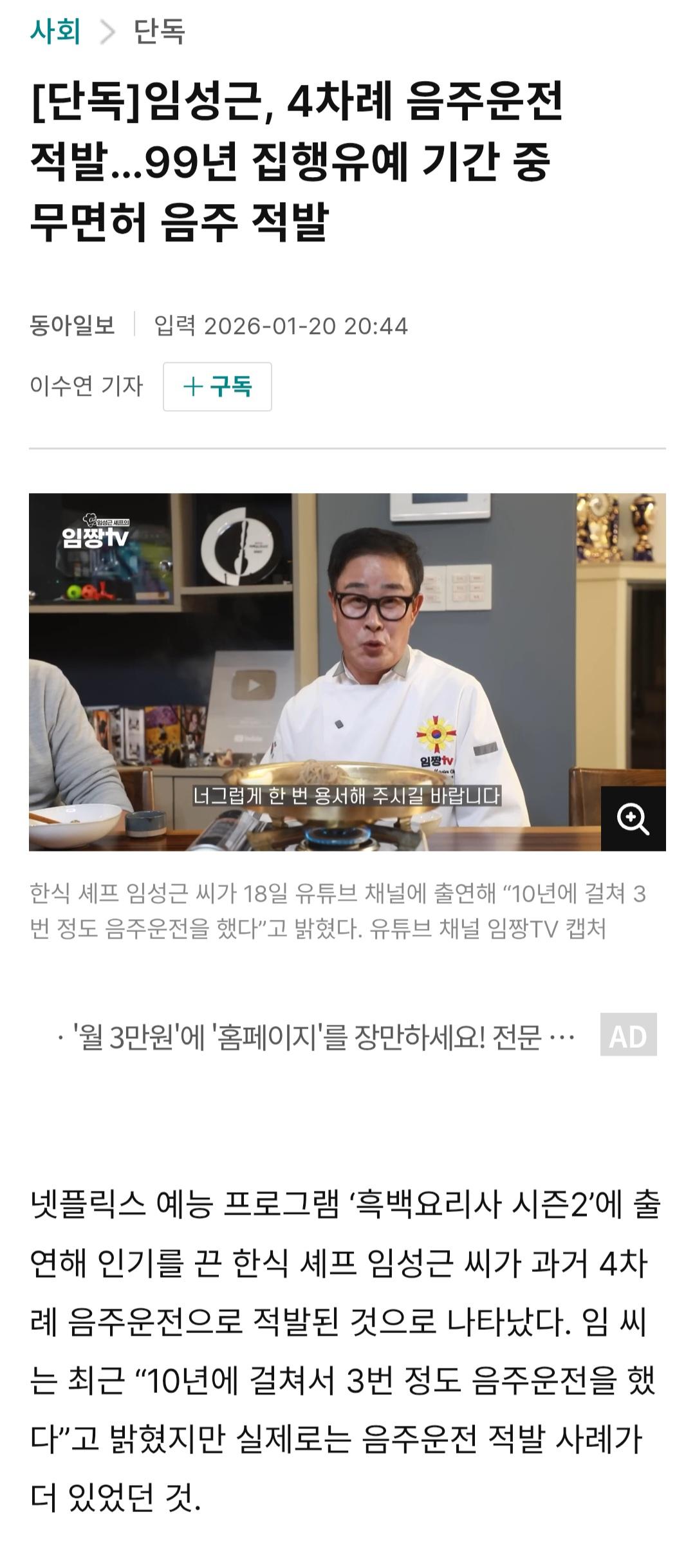 임성근, 4차례 음주운전 적발…99년 집행유예 기간 중 무면허 음주 적발 궤변론자 0 105 0 0 01.20 23:42 주소복사 복사되었습니다! 그와중에 구라치는거 보면 반성하는건 맞는건지... 0 0