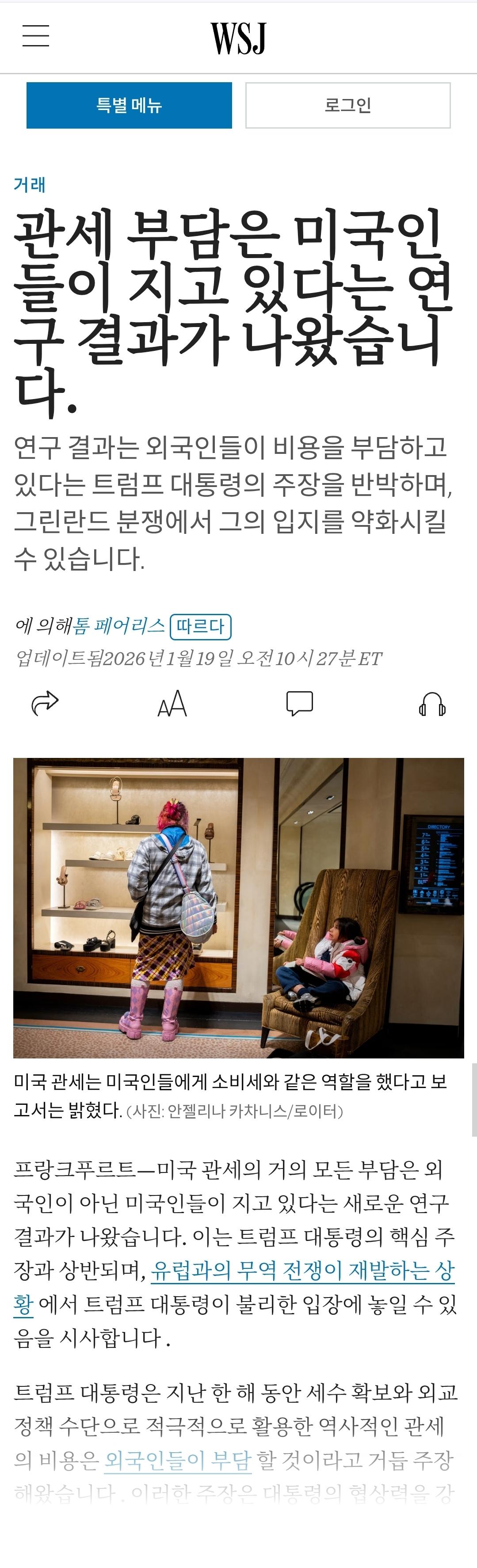 월스트리트 저널을 통해, 미국의 관세 정책으로 관세 부담을 떠안는 것은 무려 미국인 자신이었다는 기사가 나왔다.