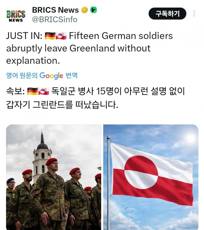 독일군 그린란드 군인 철수 왜케귀찮냐 0 148 0 0 01.19 06:48 주소복사 복사되었습니다! 15명은 진짜 장난하는것고 아니고 이탈리아가 대놓고 맨앞에서 조롱하면서 총대매니 슬쩍 빠진듯 관세 이슈도 있고 0 0