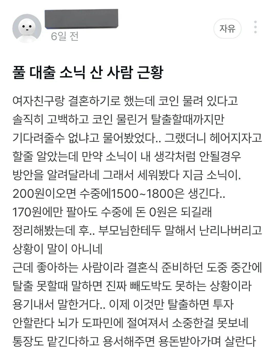 잡 코인에 빚투 영끌한 예비신랑의 향후 계획서 빨강하트 0 194 0 0 01.16 06:15 주소복사 복사되었습니다! 1. 빚져서 잡코인 투자2. 당연한 순서로 쳐물림3. 명확한 근거도 없이 코인 가격이 얼마 가게되면 운운4. 본전 타령5. 돈만 찾으면 다시는 이런 거 안 한다 소리 0 0