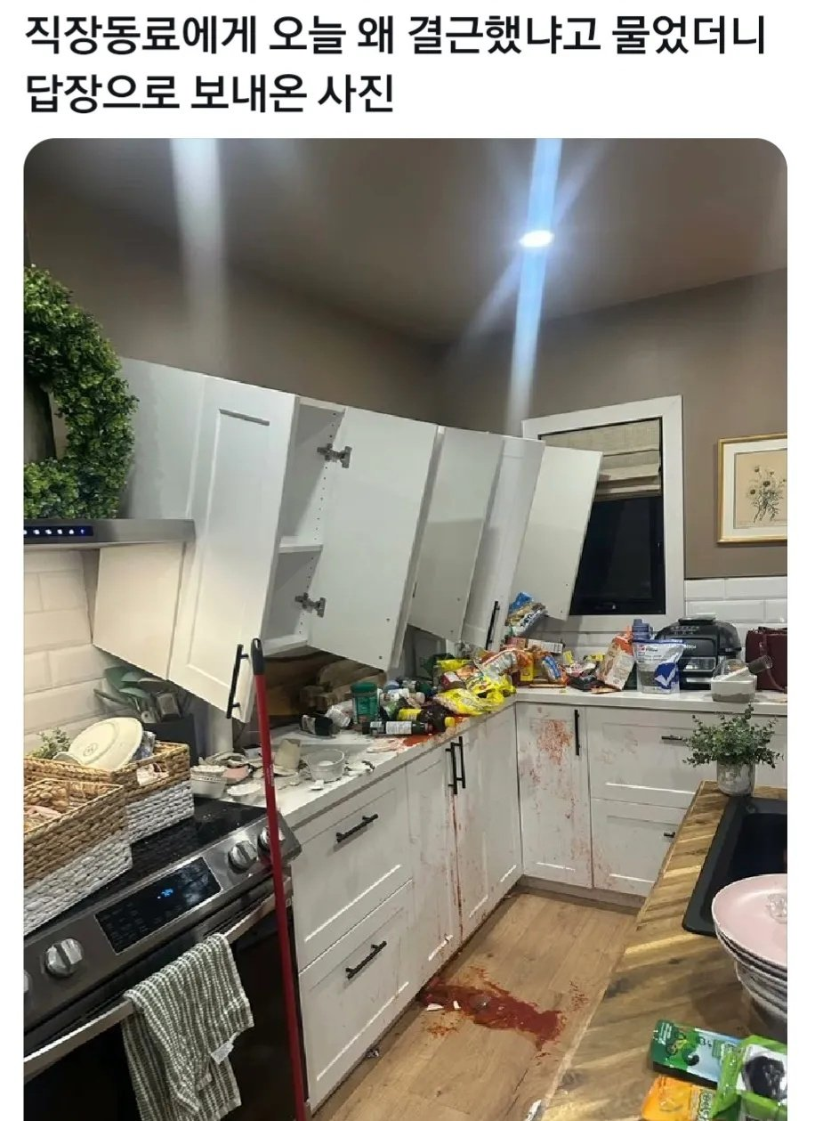 직장동료에게 오늘 왜 결근했냐고 물었더니 답장으로 보내온 사진