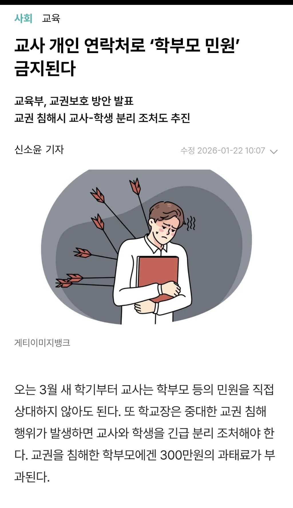 교사 개인 연락처로 학부모 민원시 과태료 300만원 부과 fapakki 0 42 0 0 01.23 16:00 주소복사 복사되었습니다! https://www.hani.co.kr/arti/society/schooling/1241062.html 과태료 300만원 0 0