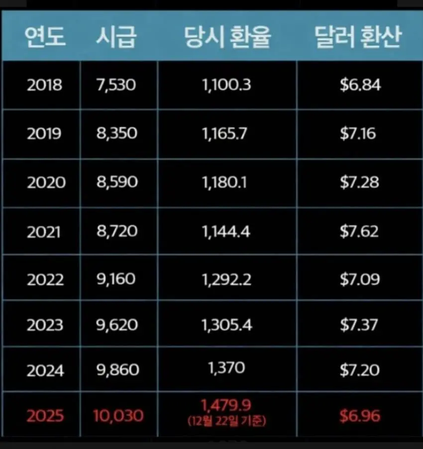 최저시급 달러 환산표