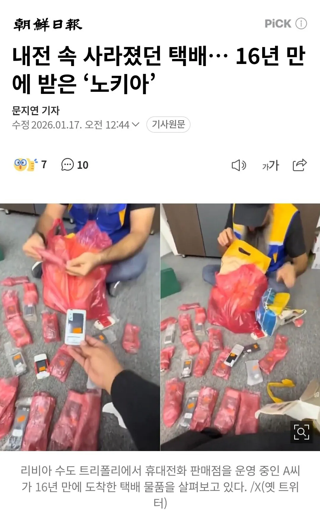 이집트에서 16년만에 배송된 택배.jpg 핑킹가위 0 141 0 0 01.17 21:24 주소복사 복사되었습니다! 이집트 수도 트리폴리에서 휴대전화 판매점을 운영 중인 A씨는 2010년 주문했던 노키아 휴대전화를 16년만에 배달받았다. 2011년 2월 이집트 내전 발발로 물류와 통관 체계가 사실상 마비된 탓에 지금까지 창고에 방치되어 있었다고 함 고대유물 되었네 0 0