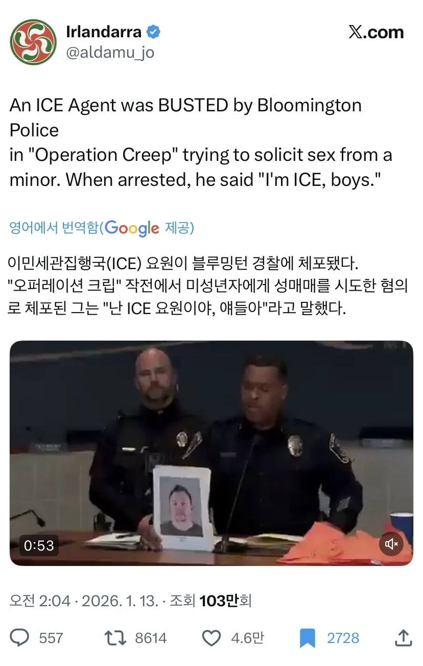미성년자 성매매로 체포된 ICE 요원이 한 말 광역데미지 0 151 0 0 01.17 15:42 주소복사 복사되었습니다! https://www.fox9.com/news/ice-employee-federally-indicted-operation-creep-sex-sting 0 0