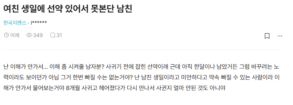 블라 어제자) 여자친구 생일날 선약있어 못본다는 남친 이해가능? MC심새 0 191 0 0 01.17 09:24 주소복사 복사되었습니다! 군대 모임이면 지방에서 표 끊어서 올라오는 사람도 있을텐데... 그냥 전 날 보면 안 되나? 글 내용에는 수원, 서울 사람들 모임이긴함 0 0