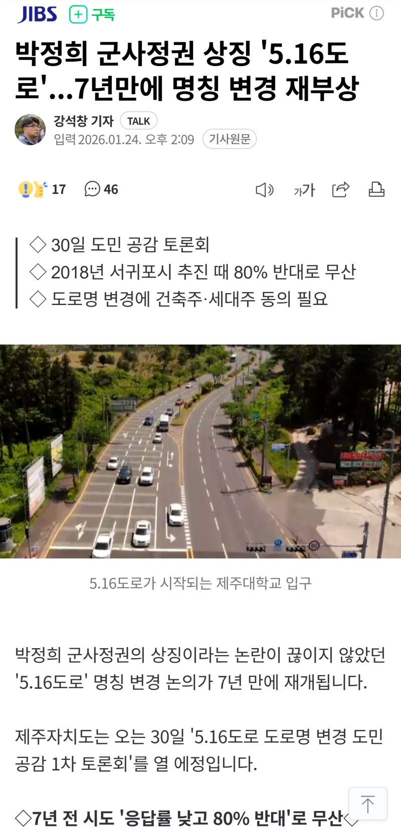 제주 5.16 도로 영국남자 0 5 0 0 1시간전 주소복사 복사되었습니다! 제주 5.16도로는 처음에는 제주-서귀포 횡단도로라고 불렸다가 1963년부터 5.16 도로라고 부르기 시작했고,서울 여의도공원 역시 처음에는 민족의 광장이였다가 5.16 광장 > 여의도 광장 > 여의도 공원으로 바뀌게 됩니다.2018년에 5.16이라는 도로 이름을 개정하려는 시도가 있었으나 무산되었고, 이번에 다시 추진하게 되었습니다. 0 0