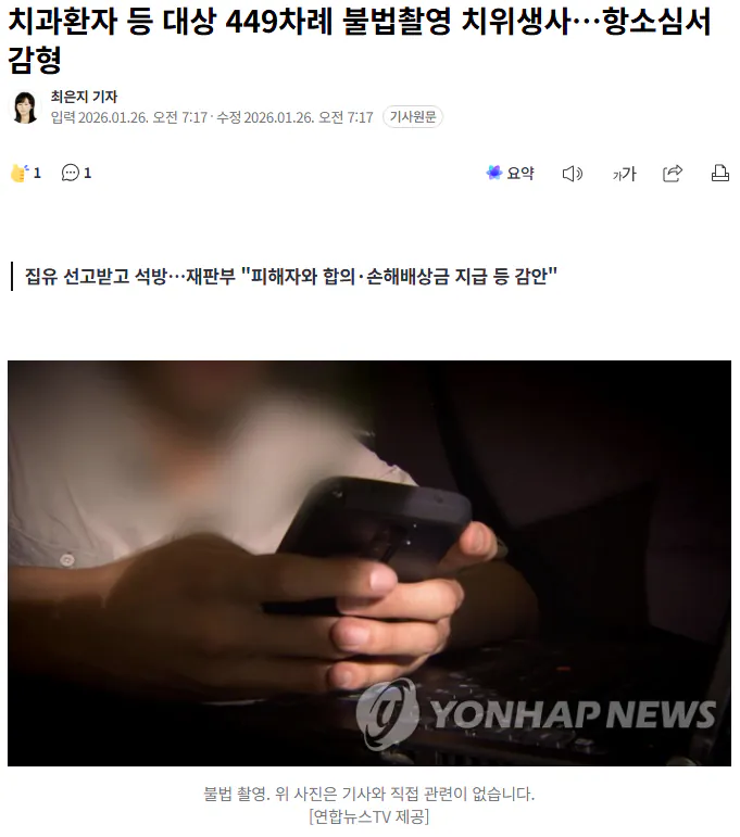 치과환자 등 대상 449차례 불법촬영 치위생사…항소심서 감형 acho 0 4 0 0 2시간전 주소복사 복사되었습니다! 치과환자 등 대상 449차례 불법촬영 치위생사…항소심서 감형 치과환자 등 대상 449차례 불법촬영 치위생사…항소심서 감형 0 0