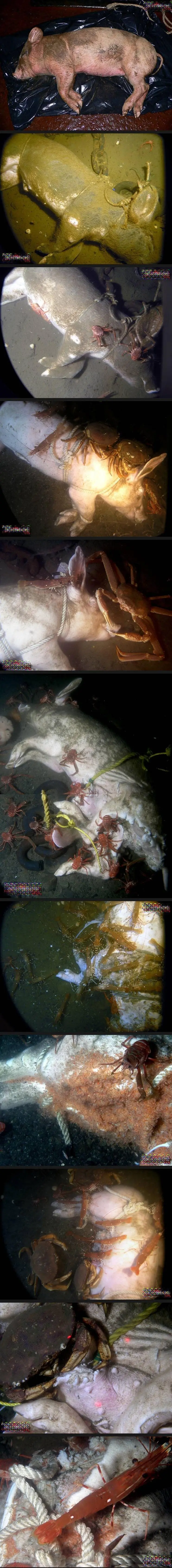 본 게시물에는 돼지사체, 사체를 먹는 갑각류, 돼지 뼈 등을 포함하고있습니다