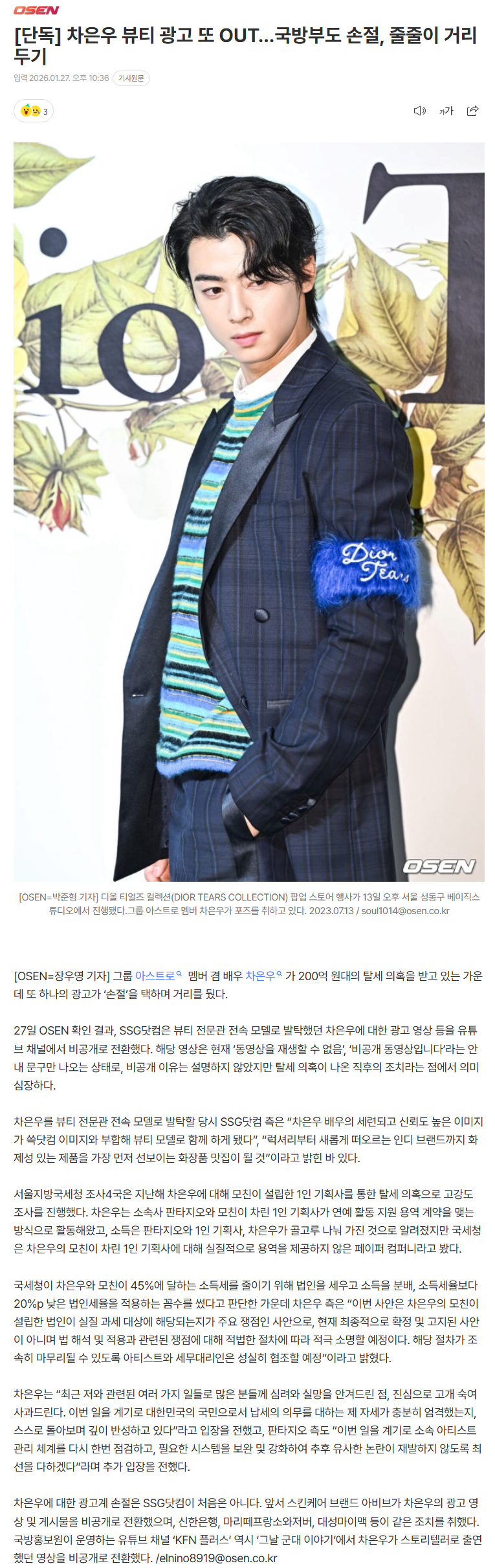 [단독] 차은우 뷰티 광고 또 OUT…국방부도 손절, 줄줄이 거리두기