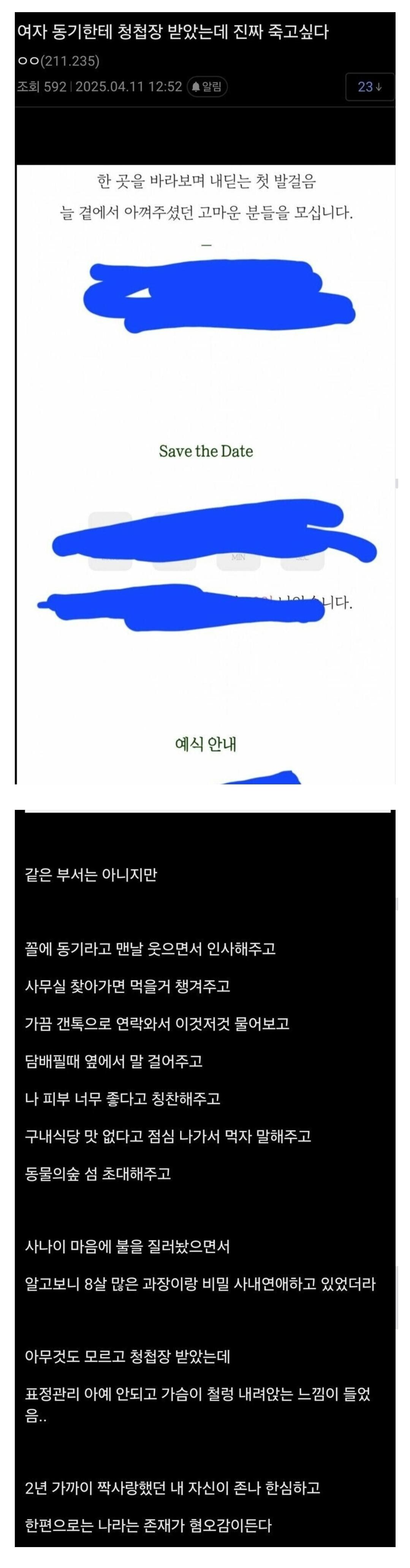 여자 동기한테 청첩장 받았는데 진짜 죽고 싶다