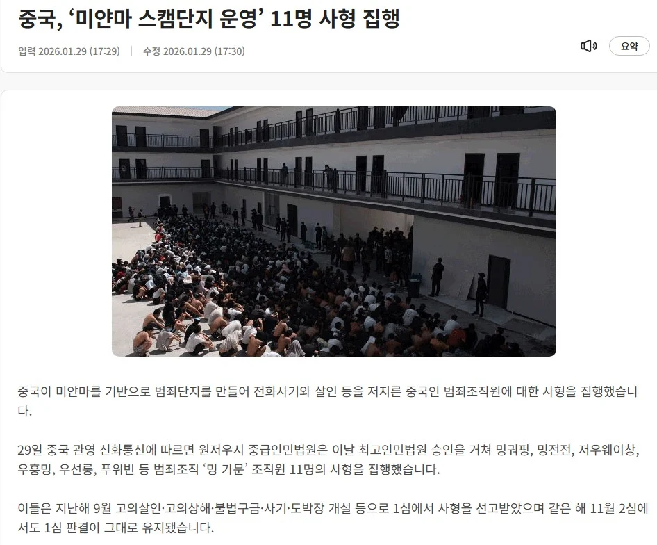 미얀마 스캠단지운영 중국인 11명 집단 사형집행