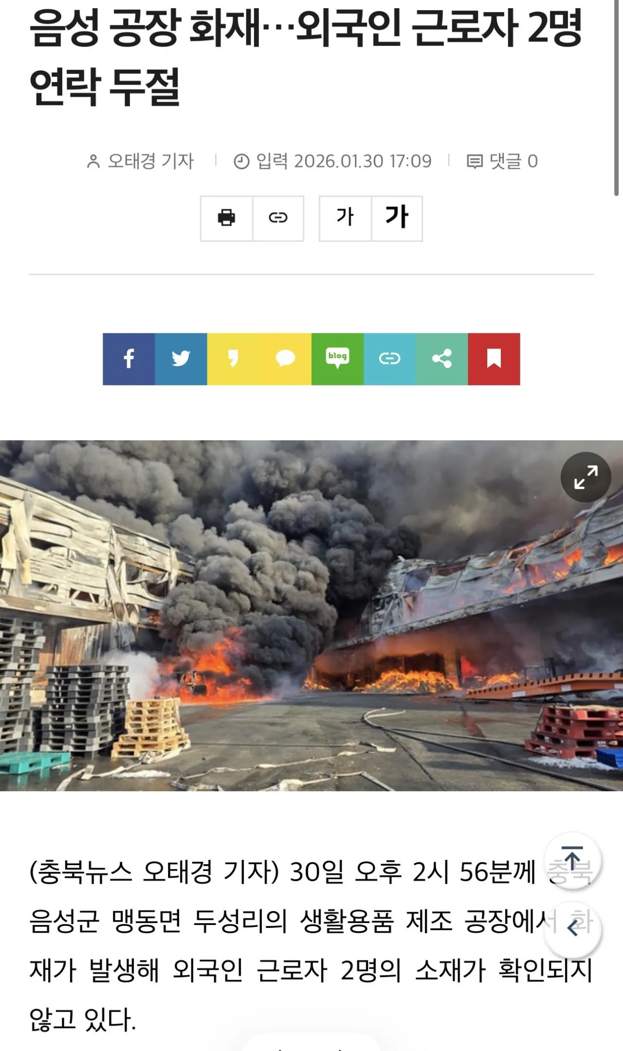 [속보]음성군 공장 화재로 외국인 근로자 2명 연락두절 연봉3천 0 7 0 0 2시간전 주소복사 복사되었습니다! 근로자 83명중에 81명은 신속하게 대피했지만 20대 50대 외국인 근로자 2명이 미쳐 못나온거로 파악된다함.. 0 0